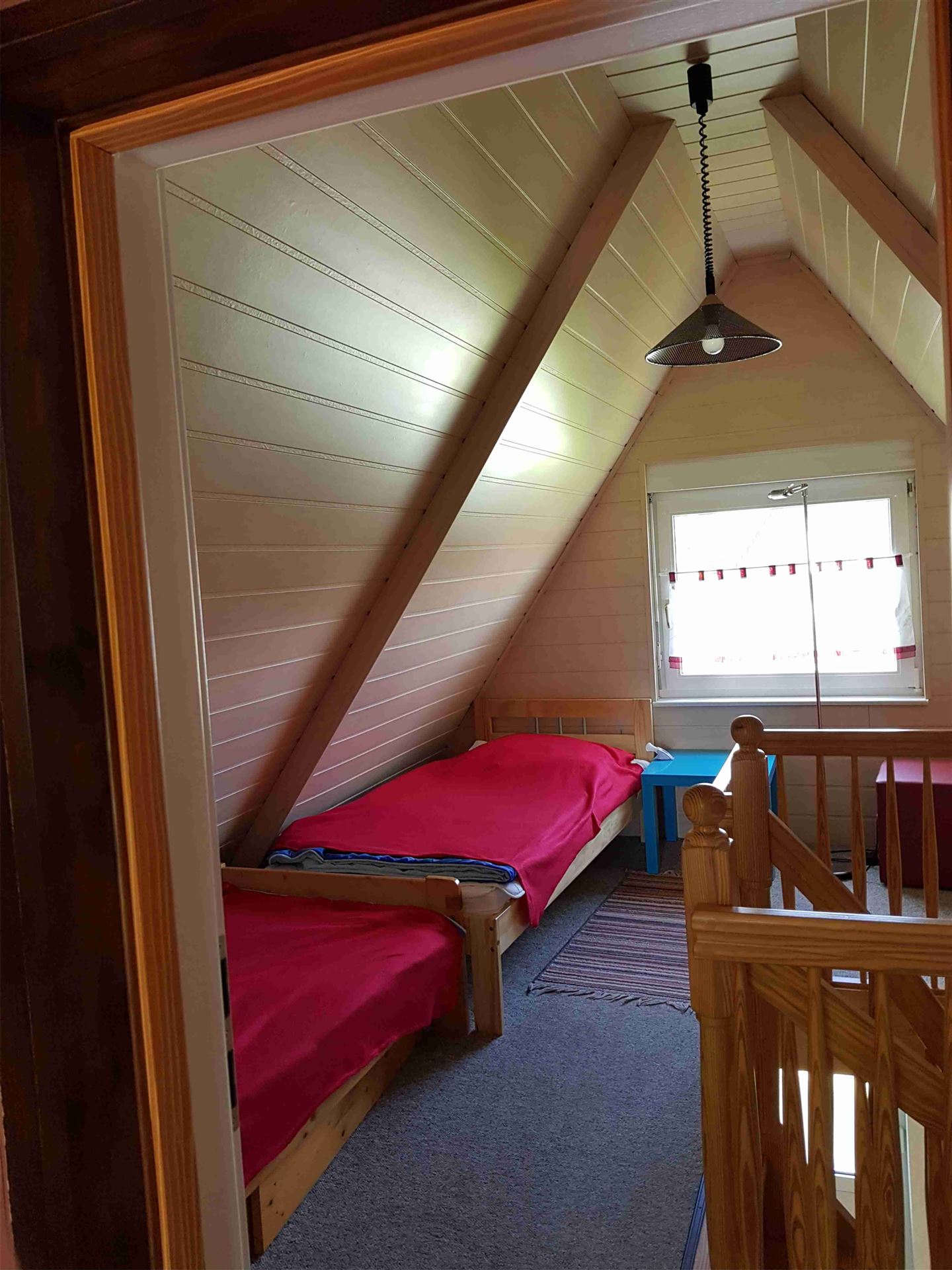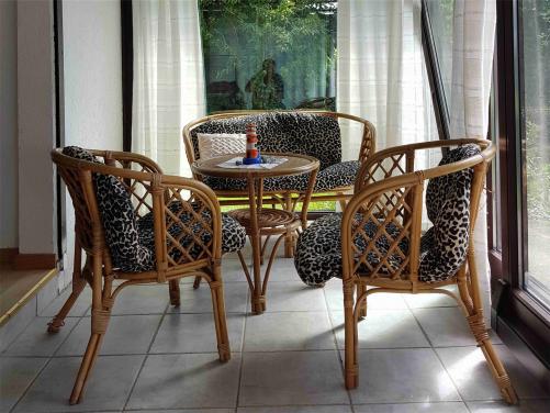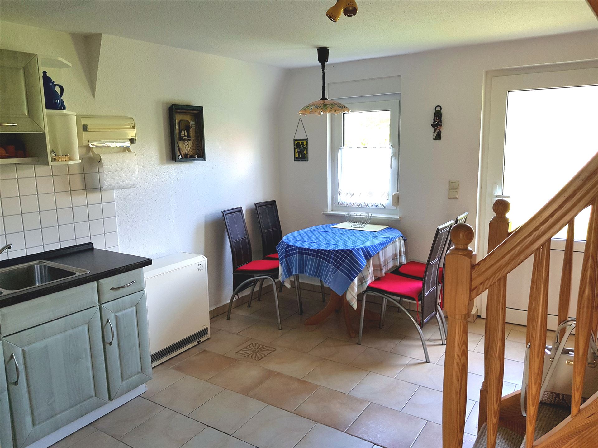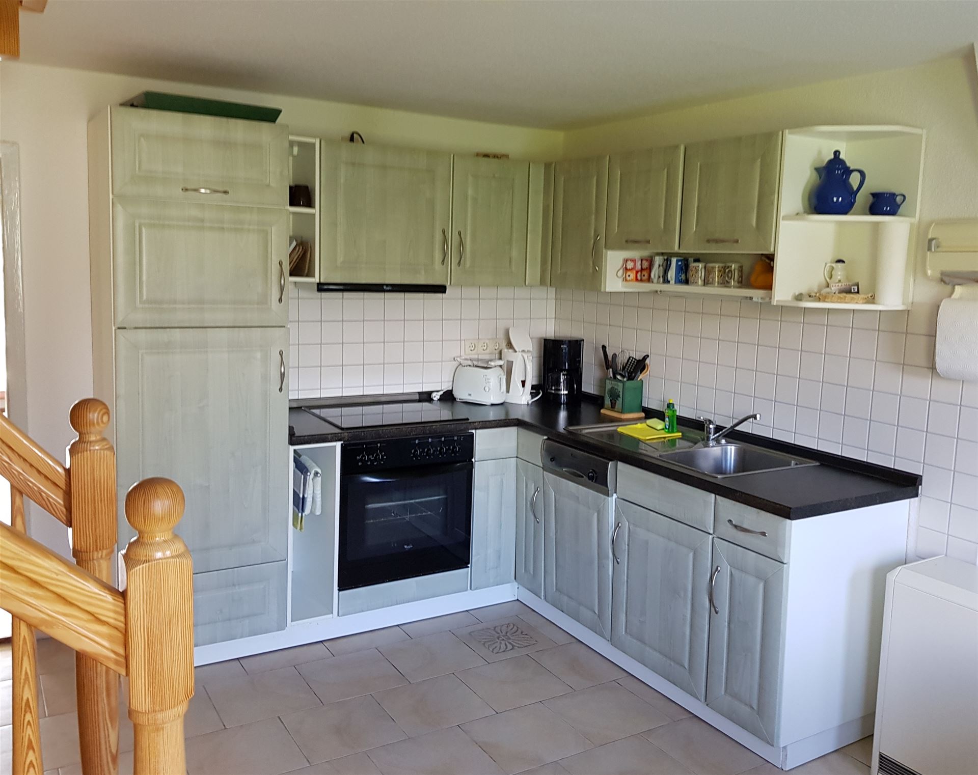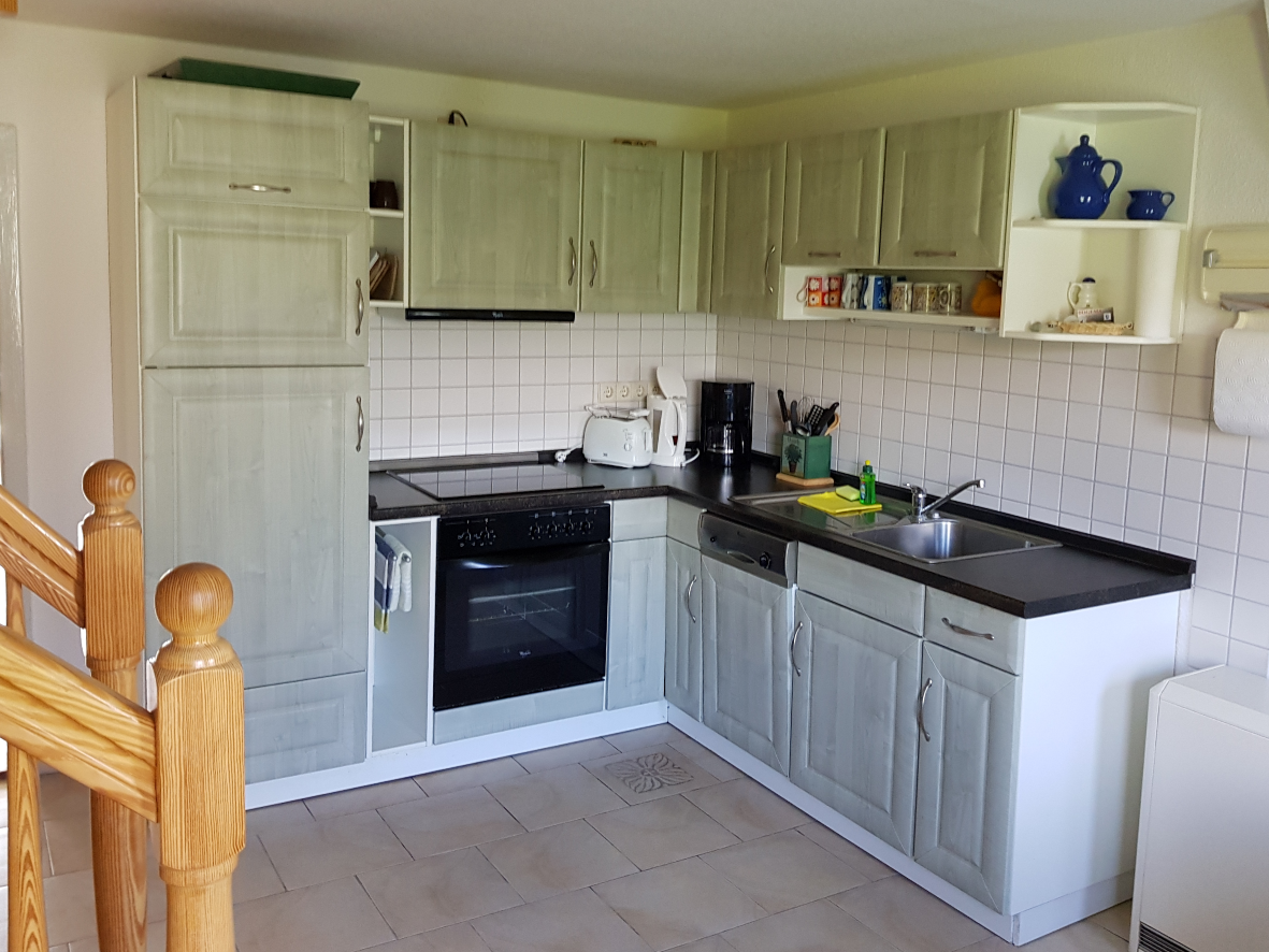 Im Erdgeschoss befindet sich eine komplett ausgerüstete geräumige Küche mit Essplatz für 4 Personen. Von hier aus führt auch eine schöne Treppe in das Obergeschoss.